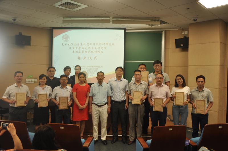 在结业仪式上,5位学员代表张筱荣、冯燕芳、余礼信、潘坤和赵晓宇等老师作了学习成果的汇报交流,安徽中医药大学的张筱荣老师从提高思想认识、更新研究理念、明确自身使命等方面分享了研修体会。河北大学的冯燕芳老师从教学、研究和会务服务三个方面谈了自己的心得收获;南昌大学的余礼信老师分享了四点感悟,指出共同努力构建中国特色哲学社会科学是中国学者的使命;四川农业大学的潘坤老师用“两级相通”、“和而不同”和“学无常师”三个关键概括了自己的研修心得;西安科技大学的赵晓宇老师从“以感动成就生命的精彩”这句话出发,分享了自己的研修体会。研修班班长郑洁老师对全班的学习情况进行了总结。她用“四个好”、“四个高”、“四个新”和“四个感”总结了此次研修培训。复旦大学马克思主义学院青年教师、本届研修班的班主任任帅军老师做了班务总结发言。他首先对包括班长、组长在内的所有研修班成员的理解与支持致以真诚感谢。作为研修班的会务协调老师,学员们的学习积极性与参与热情度让他特别感动。他还分享了自己对高研班学习交流的思考,表示这将是一段宝贵的同窗情谊。最后,马克思主义学院副院长吴海江教授从研修主题、授课品质、会务工作、学员的学习态度与学习成效五个方面对本次研修班进行了整体总结。他指出,今年既是马克思诞辰200周年又恰逢新时代元年,开展“新时代与马克思主义”的主题研讨恰逢其时。研究班的授课老师、学员和会务工作者都能全身心投入到本次研修当中,而且学员的学习心得也围绕主题深入展开,他表示这是一届举办的非常成功的研修班。吴老师用了“收获多多”、“情谊浓浓”和“信心满满”表达了对学员们的美好祝愿。他热烈欢迎大家利用各种机会,再来复旦大学交流学习。
