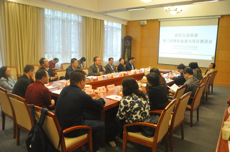 2018年10月21日,上海市高校思想政治理论课研究生分教学指导委员会在东华大学(延安路校区)召开学习新时代中国特色社会主义思想第三次集体备课和项目推进会。会议由分教学指导委员会主任、复旦大学马克思主义学院肖巍教授主持。会议内容包括:通报近日教指委活动会议及集体备课要求;有关研究生课程的理论动态交流;通报教育部基地重大项目《红色文化育人与研究生思政课教学问题及建言——以上海市情况为例》立项情况;研究生思政课分类调研报告负责人情况汇报;以及《国家意识形态建设基本文献读本》的编写、出版进展。分教指委成员和本市各高校任课教师三十多人与会。