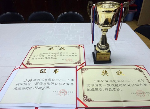 2016年6月7日,在中国统一战线理论研究会研究基地工作会议上,中国统一战线理论研究会统战基础理论上海研究基地、中国特色社会主义统一战线理论研究基地荣获2015年度中国统一战线理论研究会研究基地“流动奖杯”和“成果奖”、“创新奖”三项大奖。研究基地“流动奖杯”经过投票选举和量化考核产生,并颁发给全国十一个省市研究基地中综合成绩处于前两位的研究基地。研究基地“成果奖”、“创新奖”颁发给全国十一个省市研究基地中研究成果最多的两个单位。