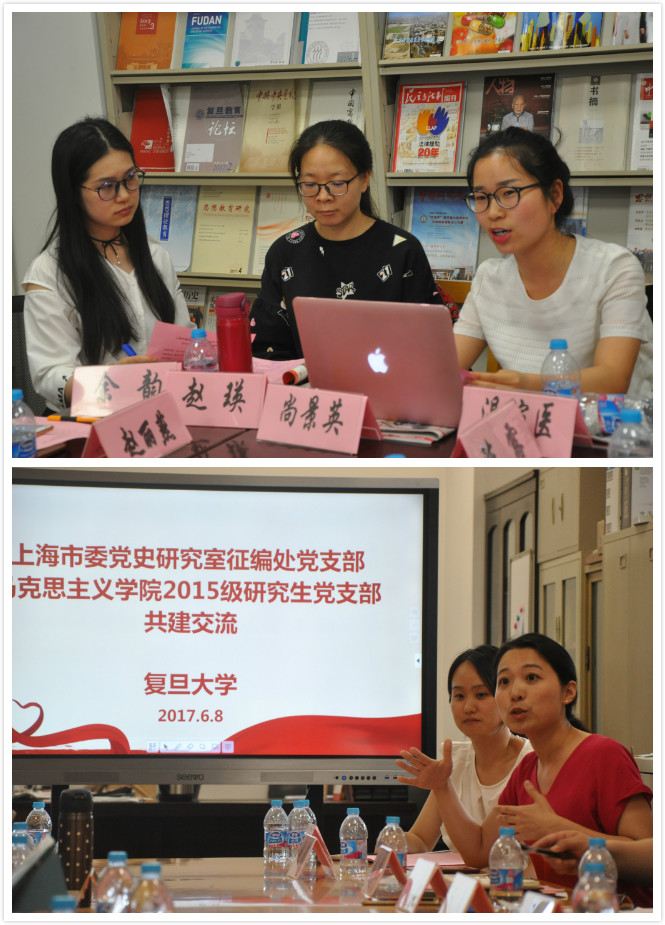 2017年6月8日下午,马克思主义学院2015级研究生党支部与上海市委党史研究室征编处党支部在马克思主义学院资料室,以“抵制历史虚无主义与增强文化自信”为主题,联合过了一次组织生活。本次以理论学习与交流为内容的组织生活是两支部共建的重要活动。